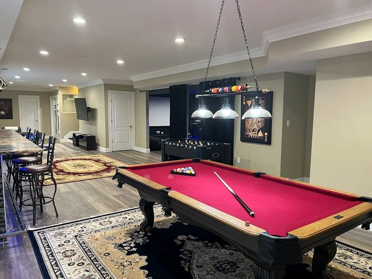 This basement finishing Fallston, MD, was designed as a complete family home entertainment paradise, complete with a living and television viewing area, kitchenette, bedroom, bathroom, game room, pool room, gym, fireplace, and luxury home theater. Visitors will feel like they have stepped into the Land of Oz. With numerous lighting options: under cabinet, in-cabinet, open shelf, and recess lighting, the kitchenette quickly sets the mood for this entire ensemble of rooms. Beneath the rich espresso wood cabinets, at the kitchenette’s back wall, and covering the bar, is an exquisite granite stone countertop with a leather finish. The bar and backsplash are dressed in a dynamic glass mosaic tile, complimenting the Shaw premium quality, half-inch thick vinyl, wood-look flooring, and espresso cabinetry. A microwave, sink, multi-level beverage display, wine rack, and wine cooler are ready to serve family members and house guests alike. And just across the aisle from that beautiful bar is likely where you will find those house guests; enjoying the Dolby Klipsch Atmos speaker system in the luxurious, beautifully lit, multi-level seating, home theater, all cleverly concealed behind a dramatic, show-stopping theater curtain in black velvet. (Pay no attention to those people behind the curtain – we’re still in Oz.) And the fun continues throughout this transformed, multi-purpose space, with contemporary, luxury seating, pool table, foosball table, widescreen television viewing, and endless choices for video game enthusiasts.Not only did our clients want to save money and time going to local movie theaters, but, like most of us, they wanted to break free of the gym membership experience. No more driving to and from the gym throughout the week, and no more costly monthly or annual fees. With their gym loaded with the special exercise equipment of their choice, every family member has only to tap their heels three times and get ready for a great workout! And to think this was only recently used for storage and folding laundry!Next to the gym is a 5×8 bathroom with a shower beautifully finished in porcelain tile with glass accents. The matching porcelain tile floor expands the look and feel of the room. The Kohler tub and one-piece toilet are perfectly installed and easily kept clean and sparkling. Of course, the vanity matches the kitchen cabinets to continue the project’s theme. You guessed it; the vanity countertop is done in the same granite stone with a leather finish for that extra touch! Let’s not leave out the bedroom, with its generous closet space, natural lighting, and beautifully finished half-inch thick vinyl flooring, built to last and last.Rounding out the ambiance of this delightful space is a wall-mounted electric fireplace that will ignite the senses. Feel the warmth it provides, see the multi-color choice of lighting, and listen to the compliments you’ll receive from your guests!! Just imagine returning from a long day at work, relaxing with a refreshing evening beverage and appetizer, and creating magical moments with your family and friends. Truly, “There’s No Place Like Home!”Here is our basement finishing page to learn more about us and what we can offer!