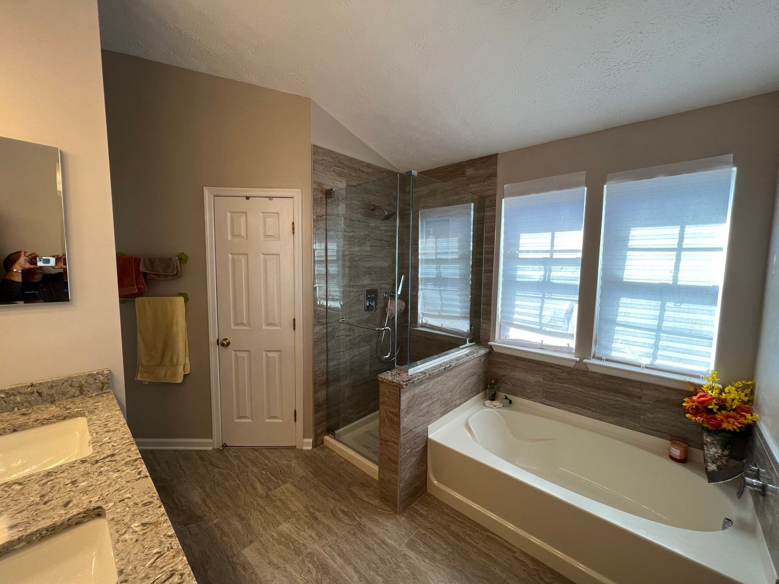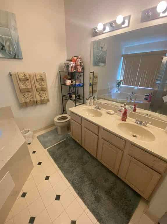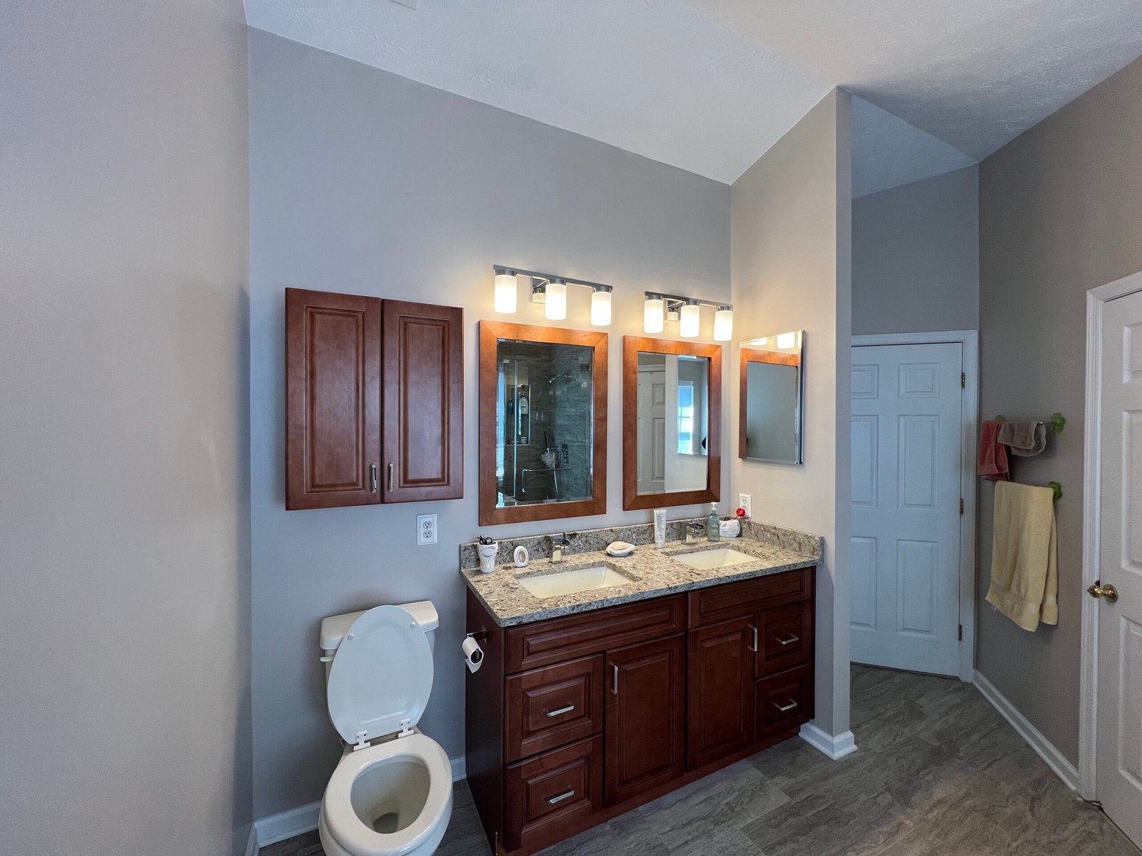 The solid wood construction double vanity has a medium tone stained finish. Raised panel door and drawer fronts create a classic look. A double door wall cabinet, made of the same solid wood construction as the cabinetry adds charm and functionality. The chantilly taupe quartz countertop, undermount sinks, with open channel faucets, matching wood framed mirrors, and new lighting, button up that portion of the room nicely. Now, add a warm, relaxing, choice of wall color, and there you have it – a master bath masterpiece.