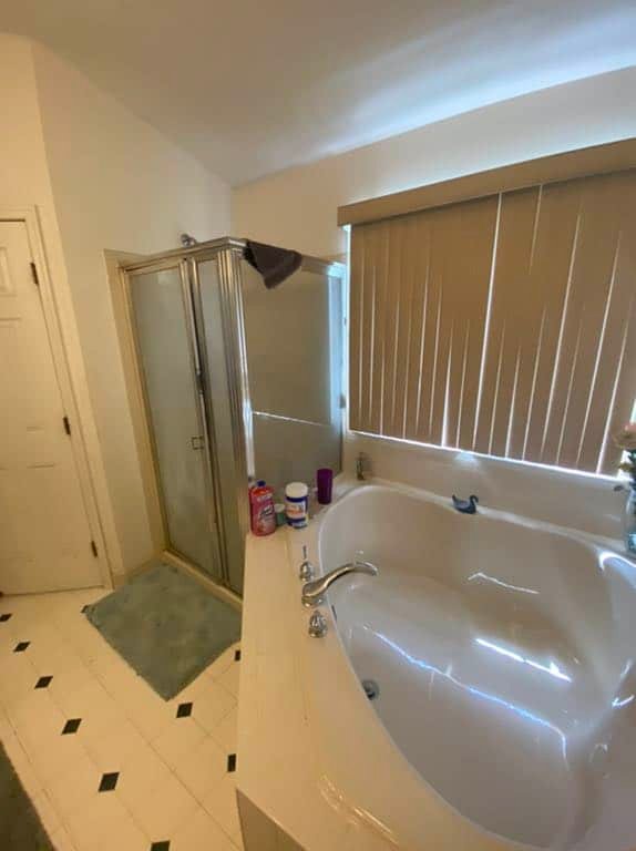 The bulky, oversized tub, with outdated and leaking fixtures, claimed way more space than was necessary. The vanity was old and discolored with mostly broken doors and drawers. Lighting was poor and the fixtures outdated. The tile floor had seen better days, but those days were a long, long time ago. How excited was this homeowner to finally be putting her long awaited project into motion? VERY!