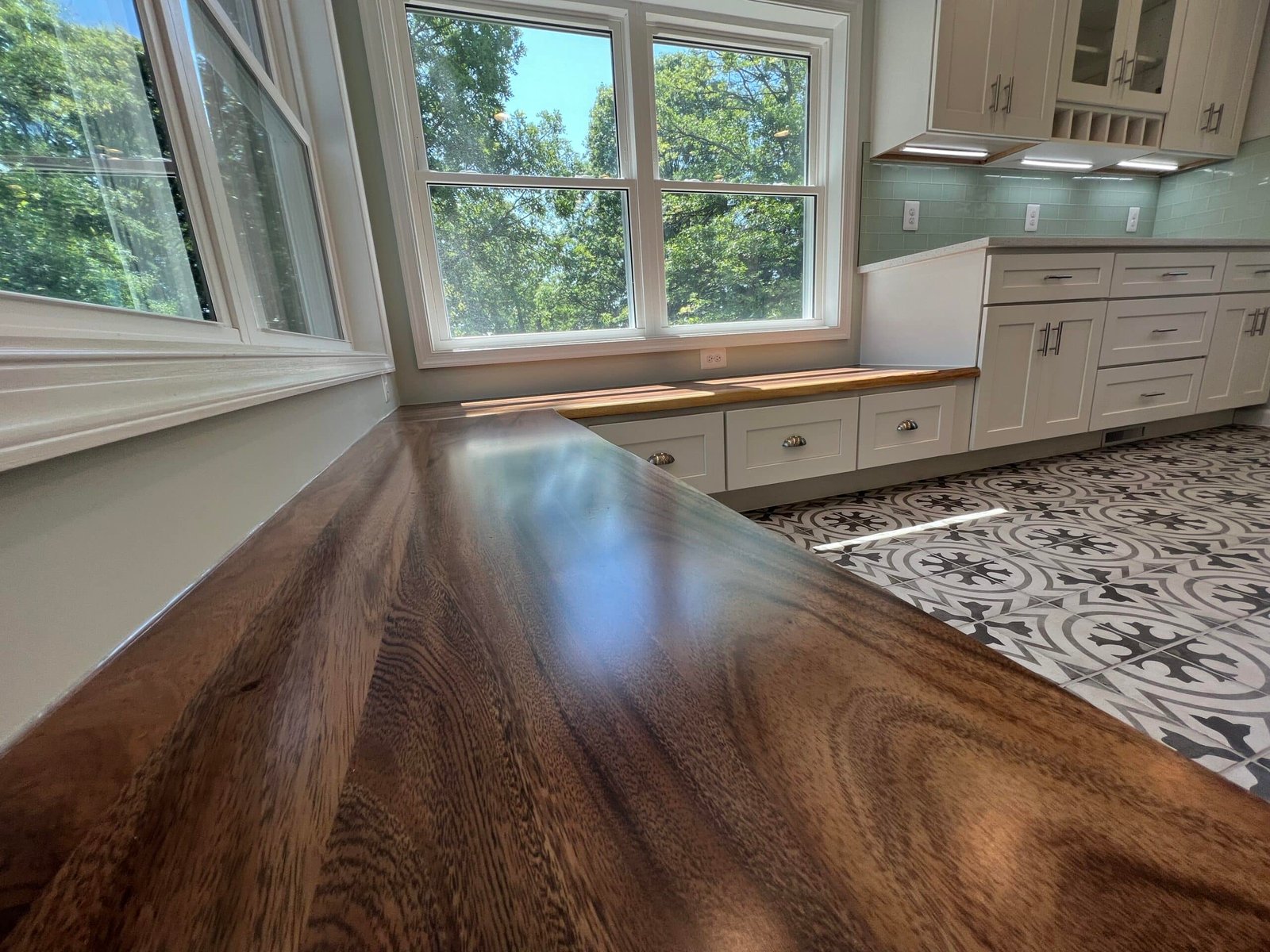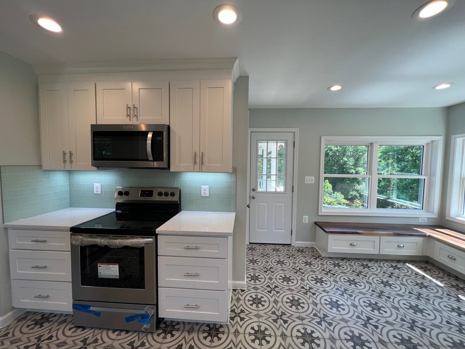 With the addition of Quartetto porcelain flooring tile, this kitchen renovation in Catonsville, MD became a work of art. Another highlight is the custom-built wood corner seating in the dining area. This gorgeous custom-made seating was perfectly positioned to enjoy the bright sunlight streaming through the newly installed windows and doors. Need we mention the seating also provided, yes, even more needed storage space.
